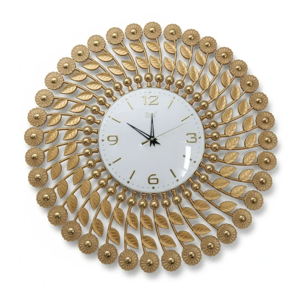 Might Be availableElevate your home decor with the Theo 5156 wall clock. Its stunning gold finish and intricate leaf design create a luxurious and eye-catching statement piece. The clock features a beautifully crafted metallic frame with a glossy finish, adorned with delicate golden leaves and accents. The clear, easy-to-read face complements the elegant design, making it both functional and aesthetically pleasing. Perfect for adding a touch of sophistication to any living room, bedroom, or dining area. Make a statement with timeless style and quality craftsmanship.