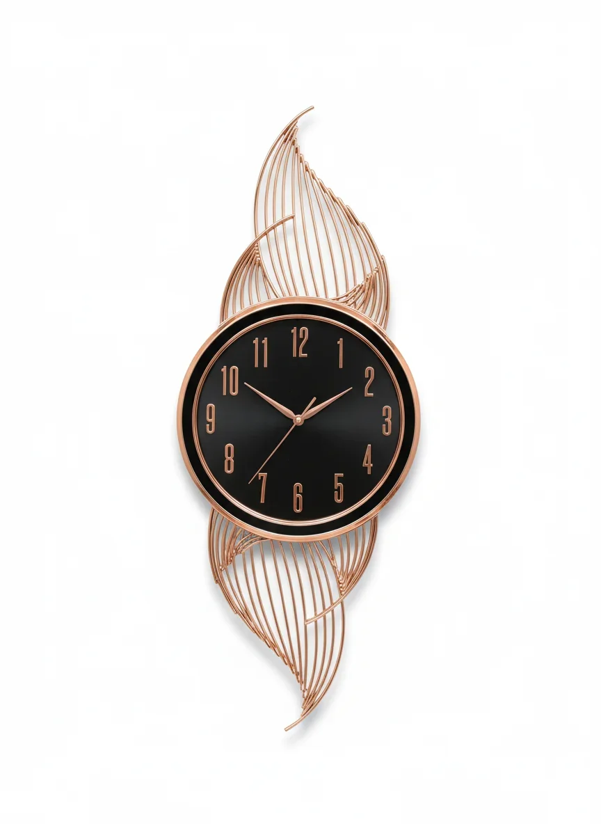 Elevate your home decor with The Clock Factory's exquisite SP751BU Wall Clock. This stunning timepiece features a captivating abstract leaf design, crafted from high-quality metal with a radiant rose gold glossy metallic finish. The sculptural frame elegantly cradles a sleek black dial, adorned with matching rose gold numerals and hands for a sophisticated contrast and clear readability. Perfect for adding a touch of modern luxury and artistic flair to any living room, bedroom, or entryway, this statement piece is more than just a clock—it's a work of art. Its silent quartz movement ensures precise timekeeping without distracting ticks. The SP751BU blends functionality with unparalleled aesthetic appeal, making it an ideal focal point for contemporary interiors. Experience timeless elegance and superior craftsmanship.