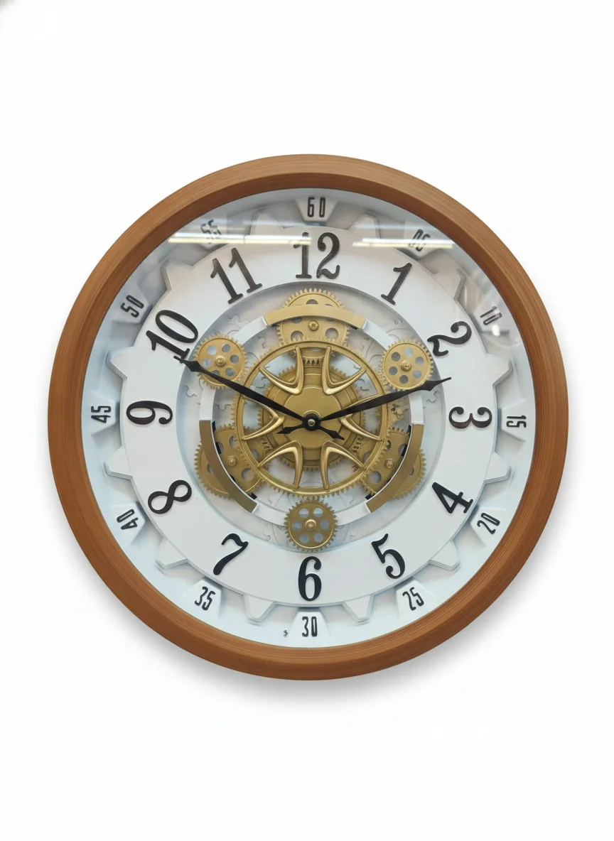 Elevate your home decor with this captivating industrial-chic wall clock. Featuring a rustic-inspired wooden frame with a subtle grain, it beautifully encircles a crisp white dial. The centerpiece is a stunning array of exposed, polished golden gears, adding a touch of vintage steampunk charm and sophisticated mechanical artistry. Large, easy-to-read black Arabic numerals for hours, complemented by minute markers, ensure clear timekeeping. Protected by a clear glass cover, this decorative timepiece combines unique design with practical functionality, making it a perfect statement piece for any living room, office, or entryway. Its blend of classic and contemporary elements will surely draw admiration.