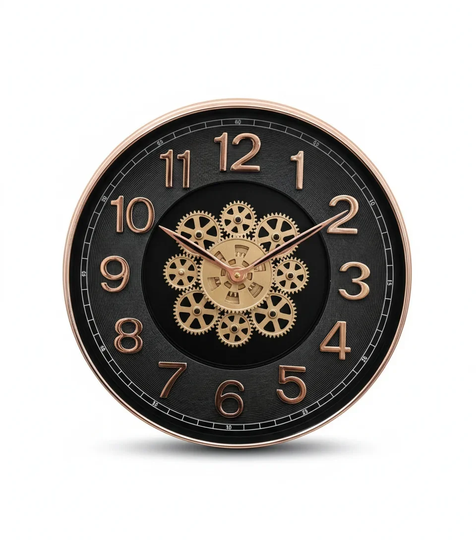 Elevate your home decor with the striking Capital 555 Steampunk Gear Wall Clock. This exquisite timepiece features a captivating open-face gear mechanism, showcasing intricate brass-toned cogs that add a dynamic, industrial-chic touch to any room. Encased in a luxurious, high-gloss rose gold metallic frame, its sleek design exudes sophistication. The deep black dial provides a perfect contrast, featuring bold, raised rose gold numerals that are both easy to read and aesthetically pleasing. The concentric textured lines on the dial add depth and a modern flair. Perfect for a living room, office, or hallway, this clock is more than just a time-telling device; it's a conversation starter and a true statement piece that blends vintage charm with contemporary elegance. Crafted with attention to detail, it promises to be a timeless addition to your interior.