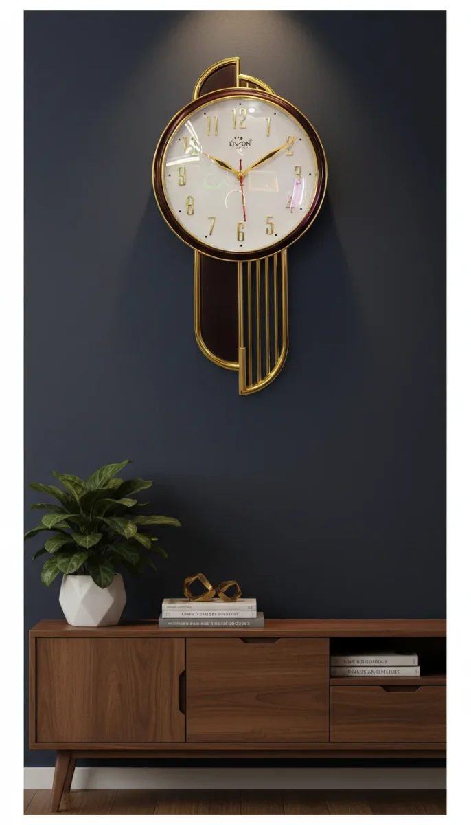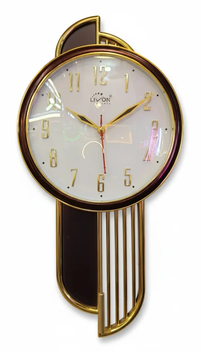 Elevate your home decor with the sophisticated Livon pd02 Wall Clock. This stunning timepiece features a sleek, glossy metallic gold frame that beautifully encases a clean white dial with prominent, raised gold Arabic numerals for effortless readability. A rich, glossy plum-colored panel accents the elegant pendulum design, creating a striking visual contrast. The radiant gold hands, including a distinct red second hand, ensure precise timekeeping. Perfect for adding a touch of modern elegance to your living room, hallway, or office, this Livon clock is a statement piece that blends timeless style with contemporary charm.