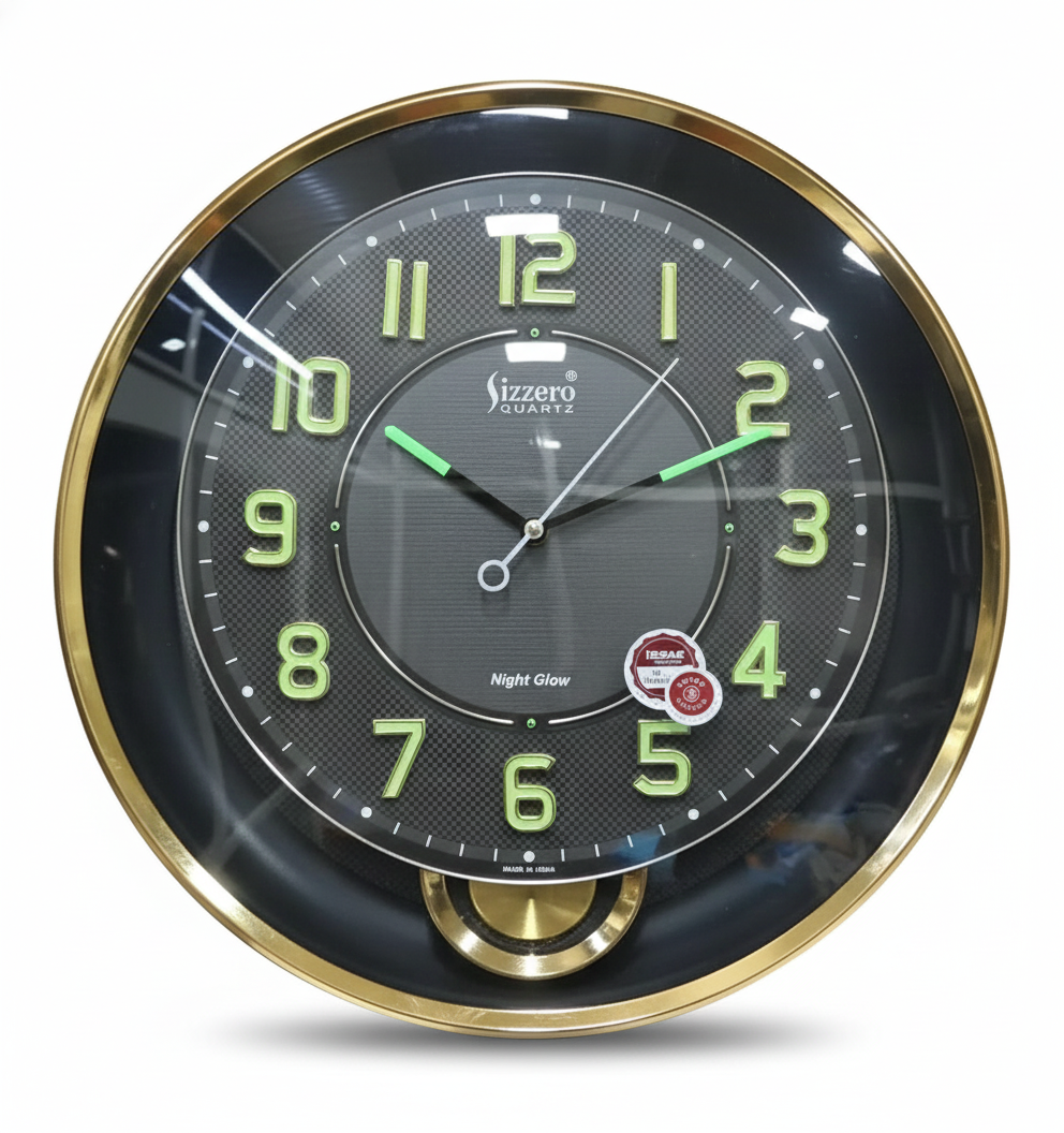 This Sizzero s-1616 radium wall clock features a stylish dark dial with prominent, luminous 'Night Glow' Arabic numerals and hands, ensuring clear visibility even in low light. Encased in an elegant glossy golden frame, its silent sweep quartz movement makes it perfect for bedrooms, living rooms, or offices, providing accurate time without disruptive ticking. The clock includes a decorative lower accent, adding a touch of sophistication to any space.