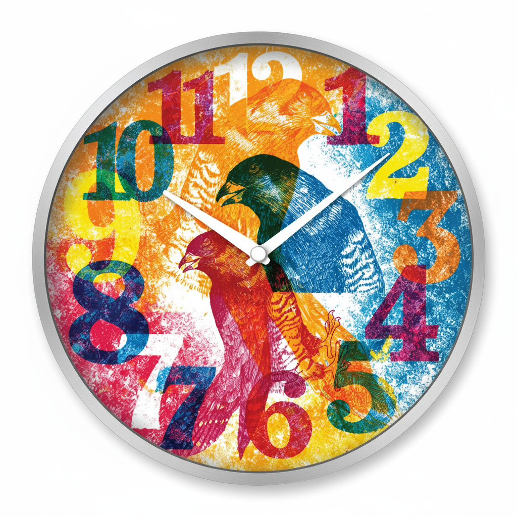 Brighten any room with The clock Factory TCF-093, a vibrant analog wall clock featuring a unique abstract design of multi-colored numbers overlaid with dynamic bird illustrations. Its artistic flair makes it a striking decorative piece for modern interiors. Perfect for adding a cheerful and contemporary touch to living rooms, offices, or creative spaces.
