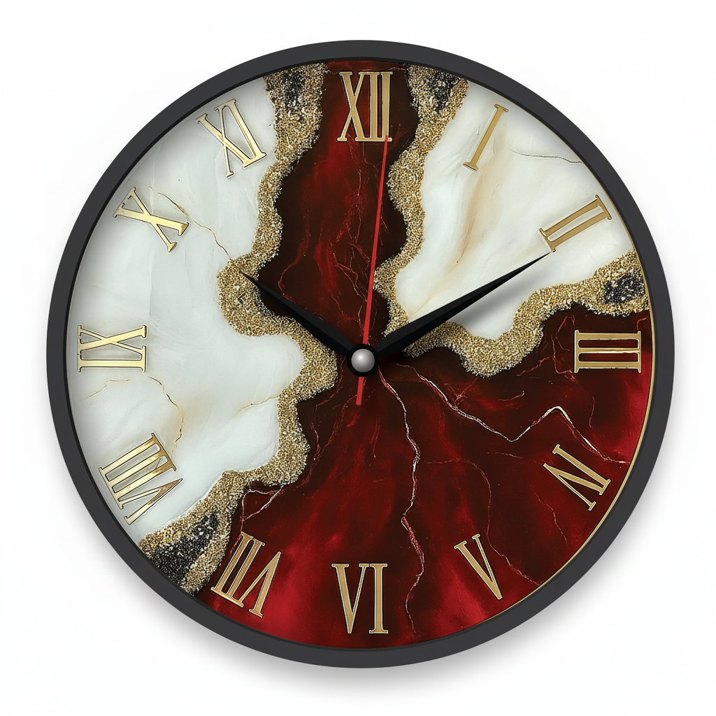 This exquisite TCF094 wall clock from The clock Factory features a luxurious geode-inspired design, blending vibrant red and elegant white resin art with sparkling gold glitter accents. Adorned with classic gold Roman numerals and equipped with an analog display, it offers both precise timekeeping and a striking decorative element. Perfect for enhancing the ambiance of a living room, office, or dining area, or as a sophisticated gift for art and design enthusiasts.