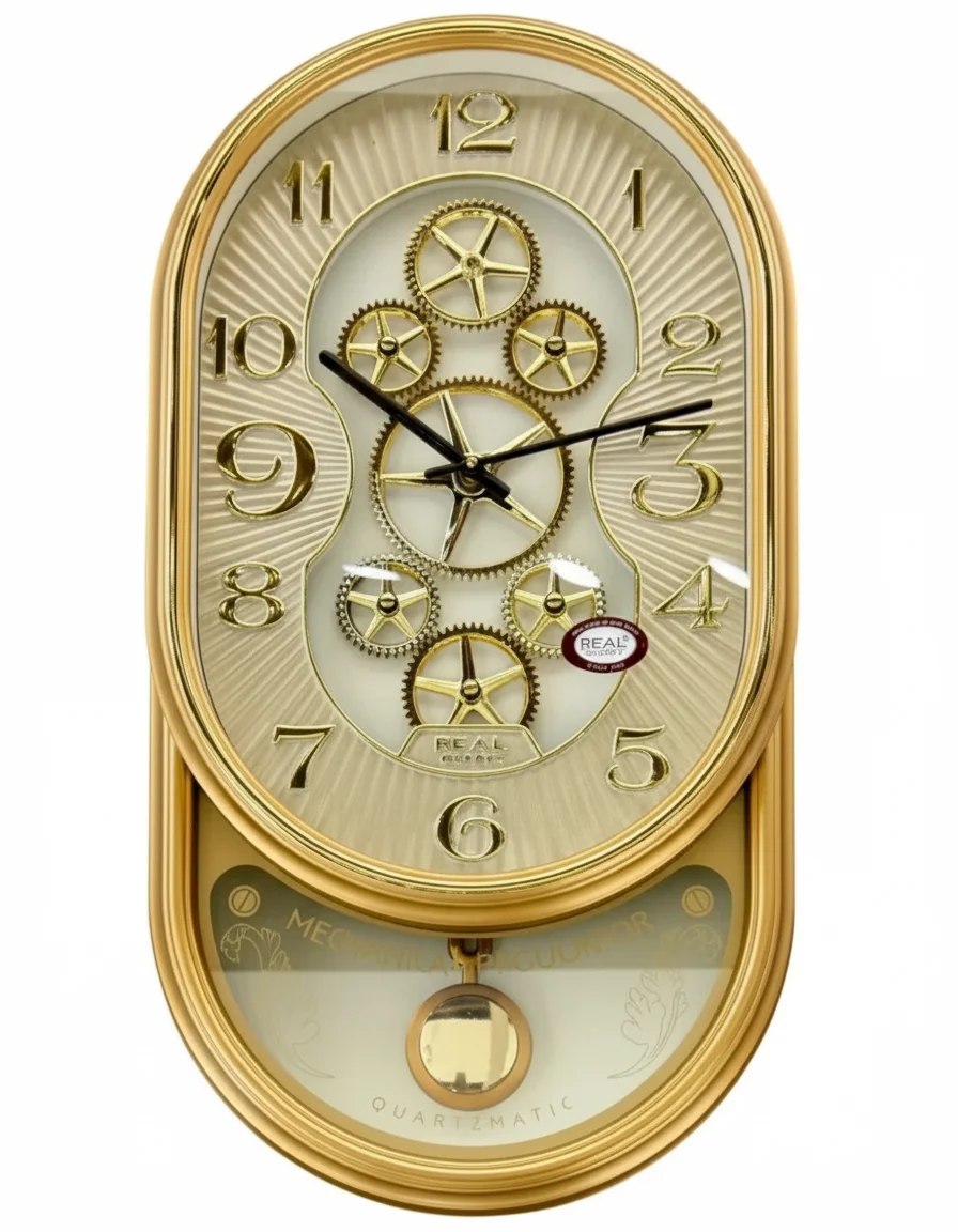 Might Be availableThis striking Real RG03 wall clock features an elegant gold-tone finish and a unique oval design, perfect for enhancing any living room or office decor. It showcases fascinating exposed decorative gears and a graceful swinging pendulum, all within an analog display powered by reliable quartz movement. Its sophisticated aesthetic makes it an ideal statement piece or a memorable gift for those who appreciate classic design with a mechanical twist.