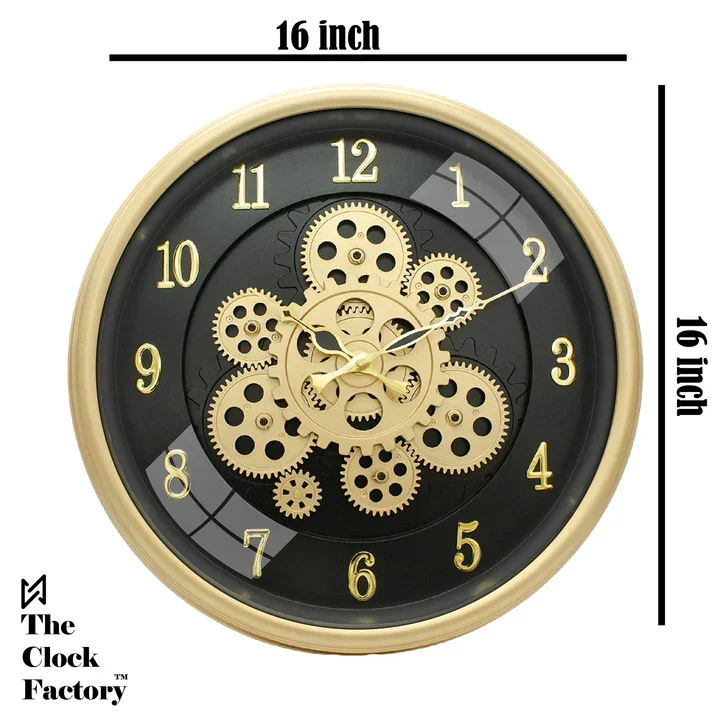 This Matiz 16-inch wall clock features a striking black dial with exposed, non-functional gold decorative gears, creating a captivating industrial-chic aesthetic. Gold-tone Arabic numerals and hands complement the intricate design, all framed within a sleek metallic gold border. Perfect as a statement piece for living rooms, offices, or bedrooms, adding both functionality and sophisticated decor.