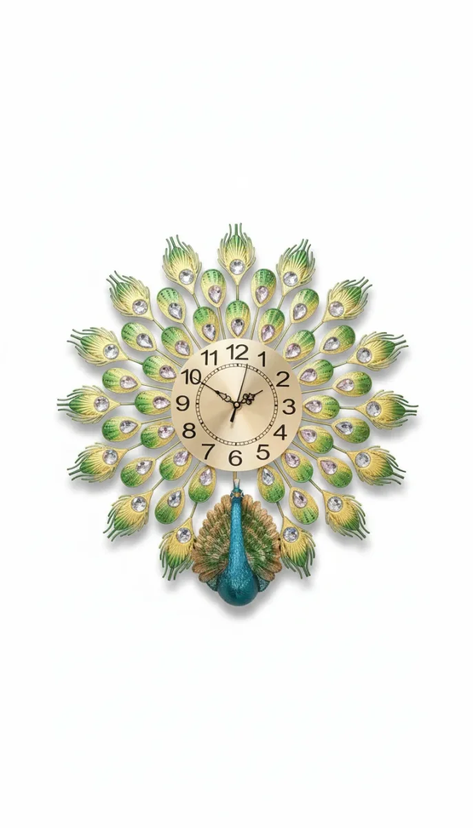 Regal Peacock Wall Clock - Gold & Green Gemstone Accent