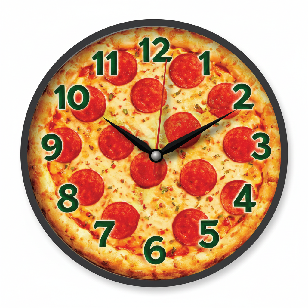 Add a delicious and playful touch to your kitchen or dining area with this vibrant pepperoni pizza wall clock from The Clock Factory. Featuring a realistic pizza design with bold green numbers, this analog clock offers clear timekeeping and a fun aesthetic. It's perfect for food enthusiasts, adding a unique and eye-catching accent to any space.