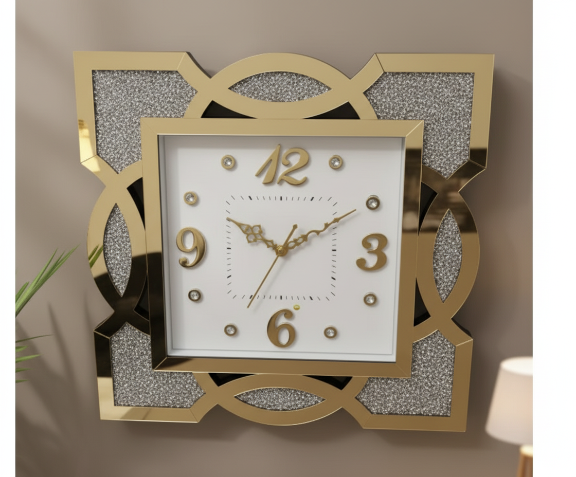 Elevate your home decor with the Sunbird 712 Wall Clock, featuring a striking gold mirrored frame adorned with shimmering silver glitter accents. Its elegant white square dial boasts prominent gold numerals and crystal markers, offering a sophisticated analog display. Perfect for adding a touch of glamour and functionality to living rooms, bedrooms, or offices.