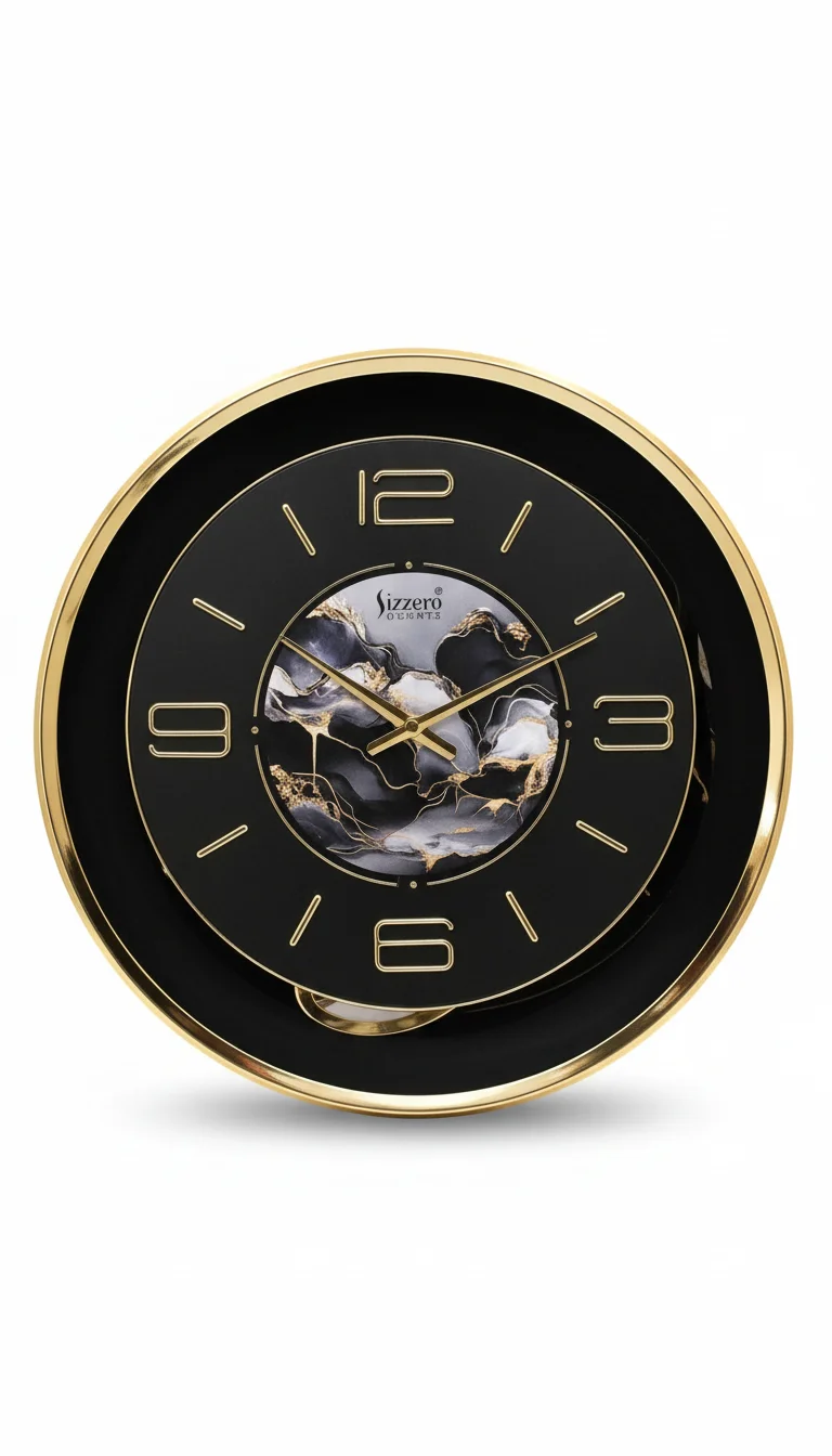 Elevate your home décor with the Sizzero 1600 wall clock. This stunning timepiece features a sleek, glossy black face with elegant gold accents. The unique marble-effect design adds a touch of modern sophistication, while the precise quartz movement ensures accurate timekeeping. The durable gold-toned metal frame provides a luxurious finish. Make a statement with this eye-catching and functional wall clock, perfect for living rooms, bedrooms, or offices.