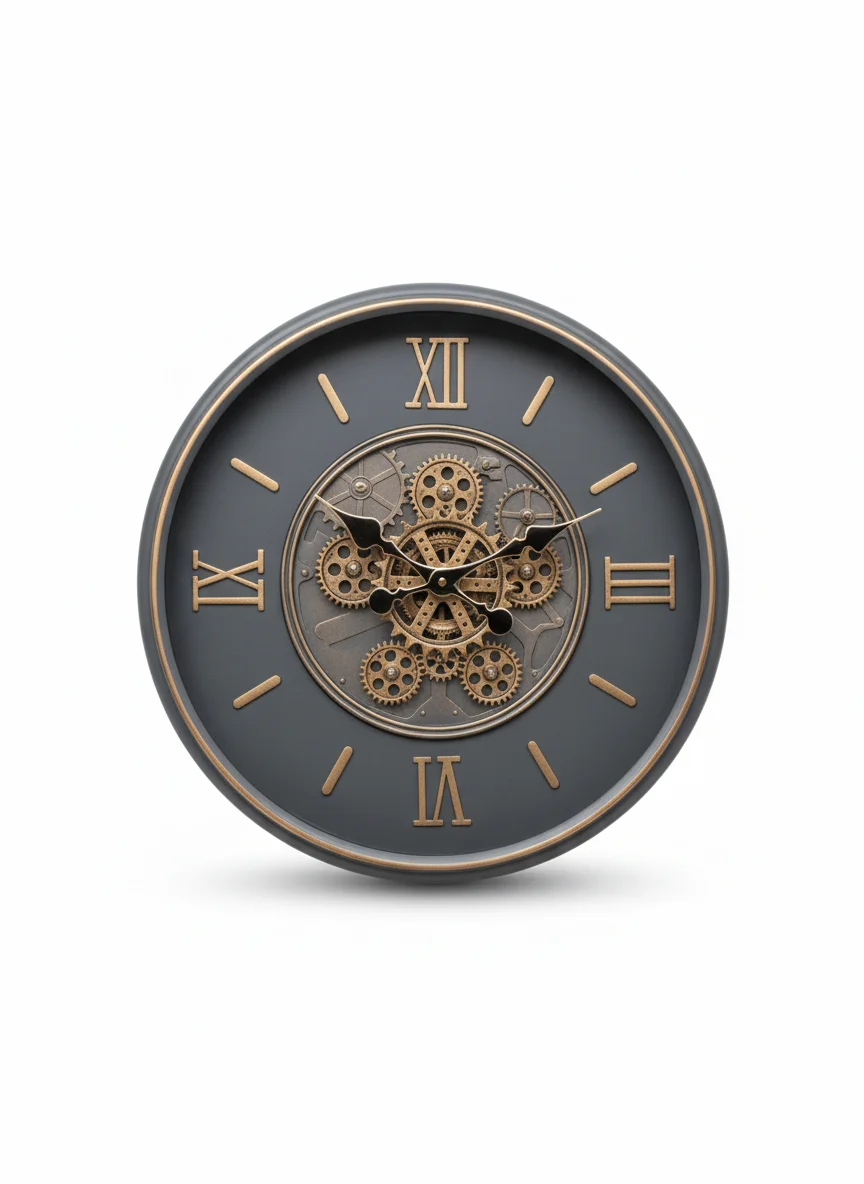Elevate your home decor with this stunning steampunk-inspired wall clock. Its large, dark grey metal frame features Roman numerals and a captivating display of intricate gold gears. The clock adds a touch of industrial chic and vintage charm to any room. The high-quality construction and detailed design ensure years of reliable timekeeping and stylish appeal. A unique conversation starter that effortlessly blends style and functionality. Perfect for living rooms, offices, or any space needing a touch of industrial elegance.