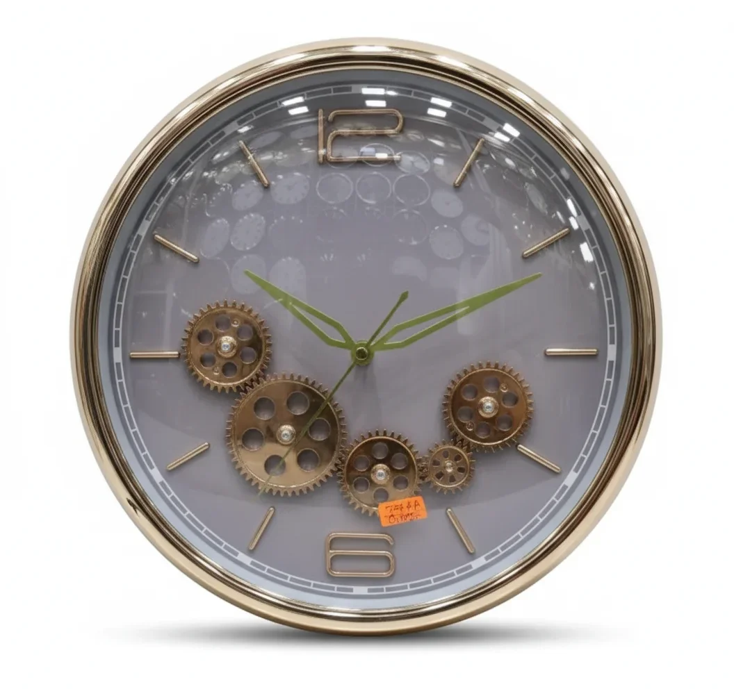 Might Be availableElevate your living space with The Clock Factory's SP 707 AA Industrial Gear Wall Clock. This captivating timepiece masterfully blends industrial charm with contemporary elegance. It features a radiant champagne gold frame with a high-gloss, polished finish, adding a touch of sophisticated shimmer to any room. The mesmerizing open-gear design, showcasing intricate brass-toned cogs and wheels, creates a dynamic visual focal point. The clean grey dial is beautifully complemented by sleek metallic bar hour markers and bold, stylized '12' and '6' numerals, all highlighted by vibrant, contrasting green hands for effortless readability. Perfect for modern, industrial, or even transitional interiors, this wall clock is more than just a time-teller; it's a unique statement piece that brings a blend of artistry and precision to your home or office decor.