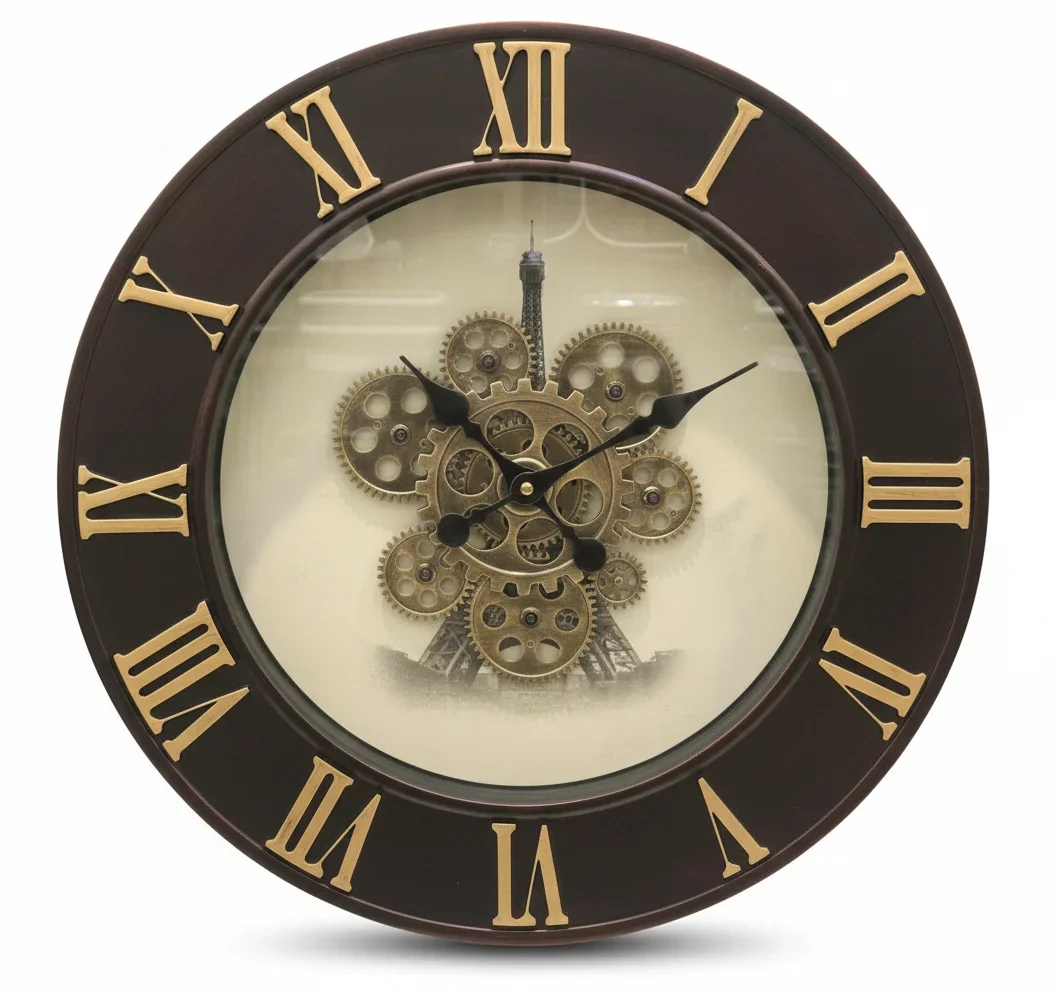 Elevate your home decor with "The clock Factory" SP 714 D, an exquisite Industrial Chic Wall Clock that masterfully blends vintage charm with modern elegance. This stunning timepiece features a robust, dark bronze frame with a beautifully distressed metallic finish, complemented by bold, raised gold Roman numerals that exude classic sophistication. The true highlight is its captivating open-faced design, showcasing intricate, decorative exposed gears in a brilliant brass tone. Behind this mechanical artistry, a subtle silhouette of the iconic Eiffel Tower adds a touch of Parisian romance and wanderlust. Perfect for adding a unique focal point to your living room, study, or office, this wall clock is more than just a time-teller; it's a conversation starter and a testament to timeless style. Crafted for discerning tastes, it combines reliable functionality with unparalleled aesthetic appeal.